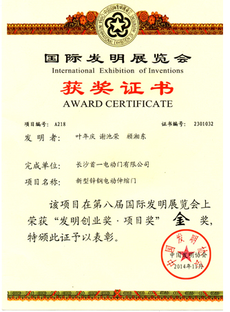 長沙首一電動門有限公司獲我省企業類項目金獎